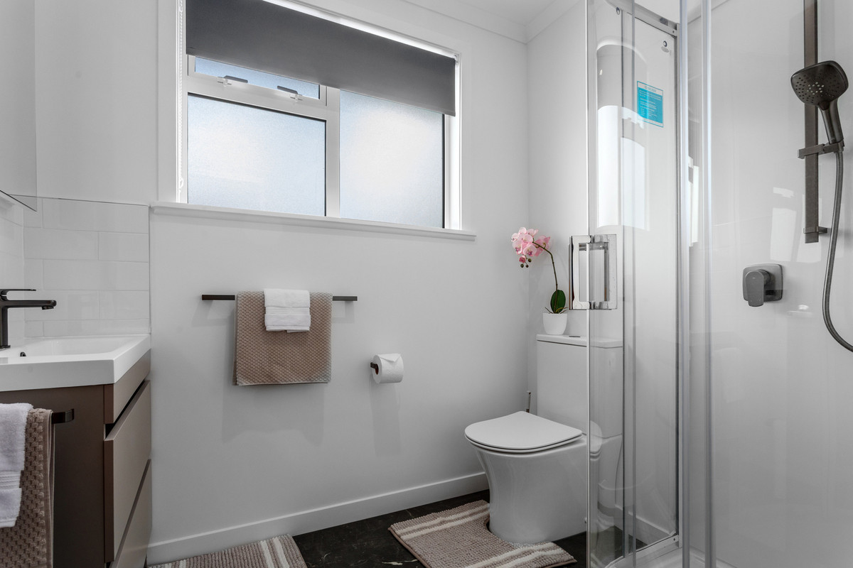 – New bathroom with modern shower, vanity and toilet