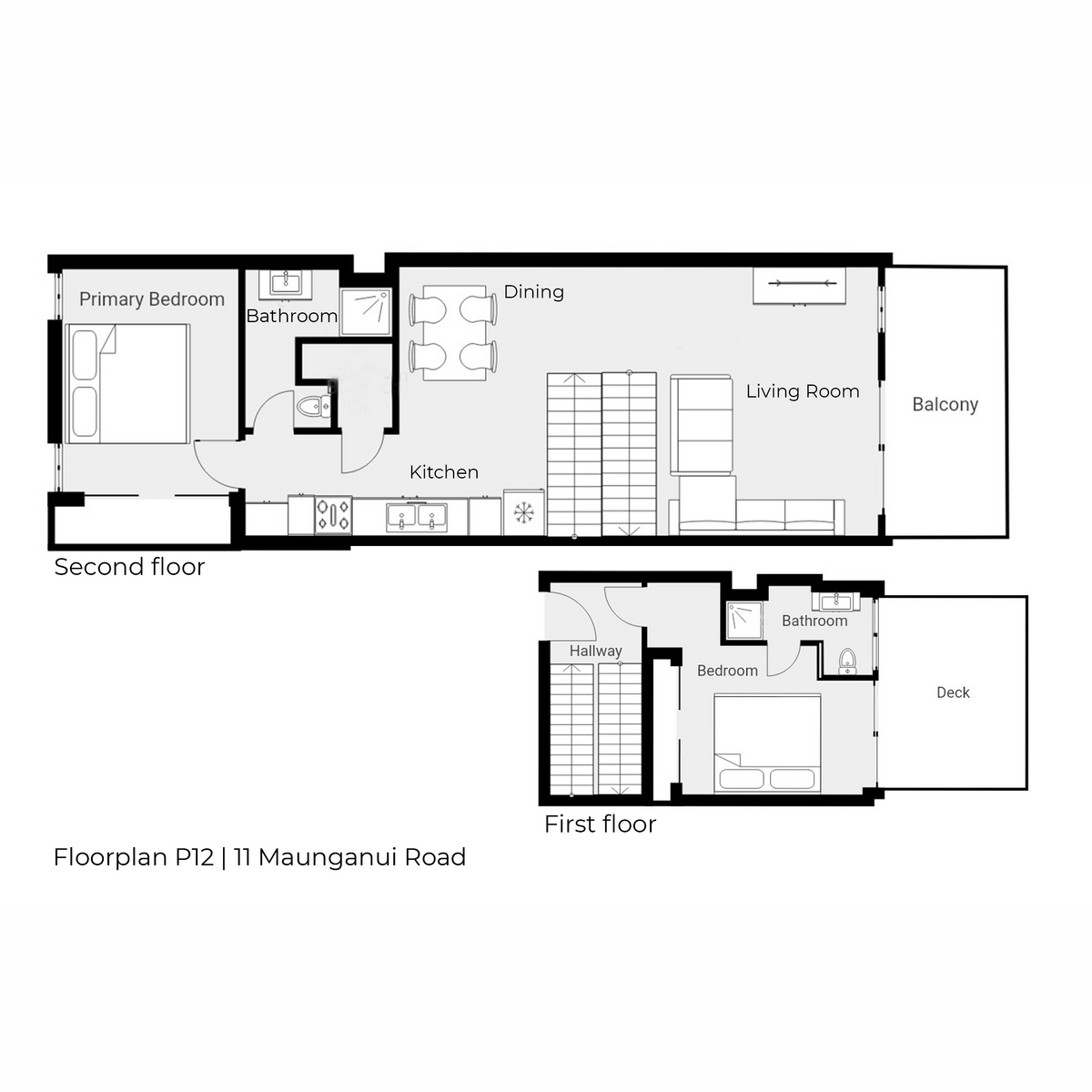 With two generous bedrooms – one on each level both supported by their own bathrooms, the layout offers space, privacy, and flexibility. The ground floor bedroom opens directly to a sun-soaked deck, a tranquil spot to savour your morning coffee. Upstairs, the second bedroom pairs with a sleek bathroom, while the galley-style kitchen anchors the open plan living space. From here step out onto a second deck, perfect for alfresco dining or unwinding in the salty breeze.